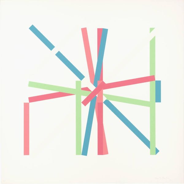 Editor: Kenneth Martin’s ‘Rotation ‘Frankfurt’ II’ features these intersecting bars of color. The composition seems so precise, almost manufactured. How do you see the artist's hand in this piece? Curator: It's fascinating how Martin uses industrial colors and geometric forms. Consider the silk-screening process: each layer, each plane, is a product of labor and a specific technology. Is this a celebration or critique of industrial production? Editor: So, it’s not just about the final image, but also the "how" and "why" it was made? I never thought about it that way. Curator: Precisely. Reflect on the socio-economic context in which this work was created. How do material choices impact our interpretation? Editor: I see now, understanding the materials and process gives the art more depth!
