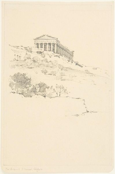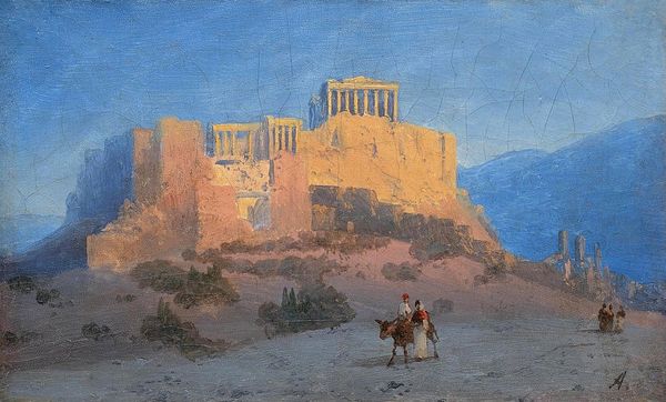 Editor: This oil painting, called "Columns," by Konstantinos Maleas, feels both imposing and strangely… dreamlike? The columns are solid, but the colours are so muted, it’s like seeing a memory. What stands out to you most in this piece? Curator: That dreamlike quality is spot on, I think. Maleas isn't just painting architecture; he's capturing the *feeling* of history, the weight of time. Look at the way the light seems to dissolve the edges of the buildings, making them almost ethereal. And those pale yellows and blues—they evoke a kind of nostalgia, don't they? It reminds me a bit of those faded postcards from the early 20th century. Do you get a sense of place? Editor: Absolutely. It *feels* like Greece. There’s this timelessness, like the scene has always been there and always will be. Curator: Exactly! And think about those crumbling columns. They speak to the cycles of civilizations – rising, falling, leaving their mark. It’s not just pretty scenery; there's a real sense of contemplation there. It invites you to imagine the lives that played out in the shadow of these stones. It’s almost romantic, but with an undercurrent of… melancholy? Editor: I see what you mean. The beauty is undeniable, but it's tinged with the knowledge that nothing lasts forever. This was painted to memorialize or preserve, and instead conveys decay over beauty. I hadn’t really considered the melancholy before, I think the artist did that well. Curator: Yes! That contrast, that tension between permanence and decay is so interesting. A lot to ponder on, even in what seems a relatively simple painting.