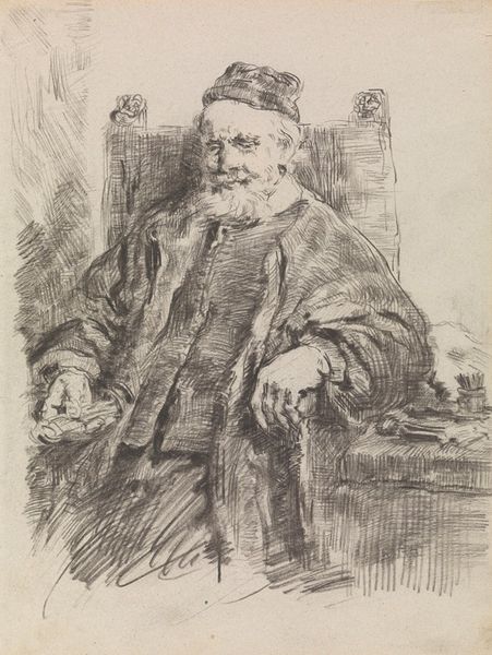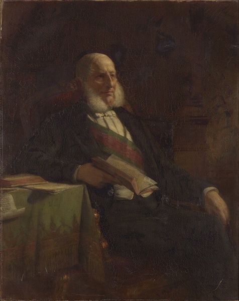 Editor: This is Sir David Wilkie's portrait of "His Highness Muhemed Ali, Pacha of Egypt." The textures seem so smooth and soft, especially in the clothing. What visual elements strike you most in this piece? Curator: The most compelling aspects reside in the calculated deployment of chiaroscuro and the interplay between the textures. Notice how Wilkie uses light to articulate the sitter's face, drawing attention to its planes and volumes. Editor: The sword stands out—its shape and golden hue are very striking. Does that draw focus away from the subject's face? Curator: While the sword is undeniably present, observe how its placement and angle guide the eye back towards the central figure, reinforcing his commanding presence within the pictorial space. Do you see that? Editor: I do now! Thank you. I see so much more through the arrangement of light and form. Curator: Indeed. Appreciating the formal qualities of this work enhances our understanding of its overall impact and intent.