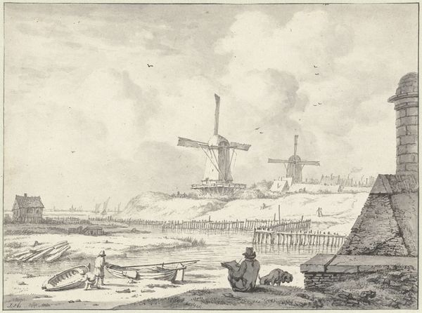 Curator: Here we have “Mill by a River,” created in 1613 by Claes Jansz. Visscher. It's currently held at the Rijksmuseum. Editor: Immediately, I'm struck by the contrast—the meticulous detail of the mill against the vast, open sky. It feels… serene, but with a subtle tension. Curator: Indeed. Visscher was working during the Dutch Golden Age, a period where landscape art became immensely popular. Prints like this played a vital role in shaping Dutch national identity. This etching showcases a picturesque, almost idealized, vision of the countryside. Editor: Right, this isn't just scenery. Look at the laborers, figures dwarfed by the landscape. It speaks volumes about the economic engine that powered the Golden Age—reliance on human labor alongside technological advancements like windmills. Who benefitted, and who carried the weight? Literally, given that figure hunched beneath the weight. Curator: Exactly. We see the windmill as this grand structure, and its placement near the river certainly would’ve allowed for a productive interchange for both local economy and long-distance trade. We must also see these images were tools that reinforced power structures and shaped narratives that were designed to inspire a burgeoning nation. The success of the Dutch Golden Age relied heavily on social factors and beliefs that have shaped and influenced society and that can cause some dissonance today when the original ideals have become corrupted or fallen by the wayside. Editor: Precisely. That brings me back to the emotional complexity. It is peaceful but there is a deeper sense of societal burden in its fabric. By putting that burdened laborer to our left and framing him to start his day under the dawning sun gives him hope. He could become as important and vital to the society that created this structure as the men and women whom Visscher might be emulating in this drawing. Curator: Yes. What strikes me about that is how it speaks to the nature of Visscher's audience and their view of those in servitude during that era. And also, that's the challenge: viewing historical artwork and acknowledging how such structures played a major role in contemporary society while still honoring those whose sacrifice, too often, were overlooked. Editor: Absolutely, and by prompting discussions such as this one we can work toward the hope and dreams the man portrayed on the drawing feels and embodies by virtue of a slowly dawning horizon. We must reflect upon all participants, especially those left behind and work hard to never lose their importance.