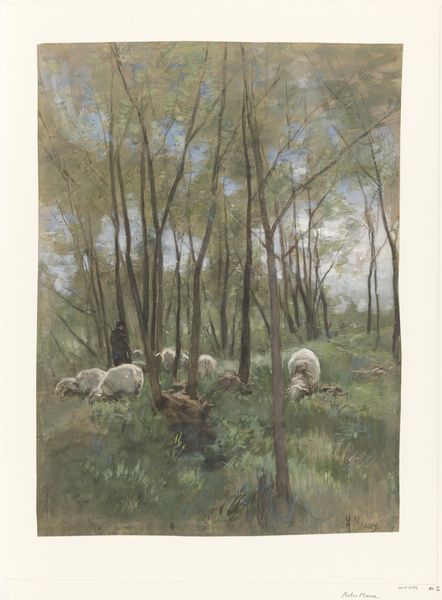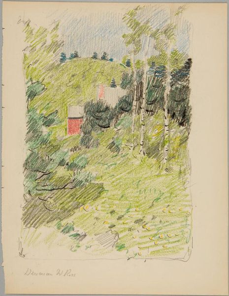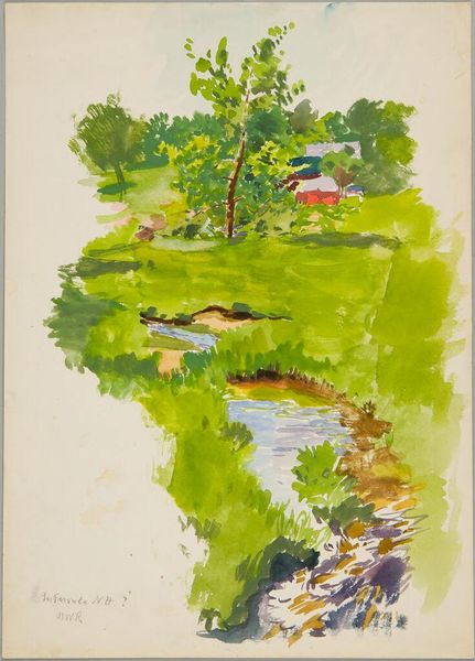 Curator: This watercolor work is entitled "Landscape; verso: Seated Young Man in Profile," created by Denman Waldo Ross. Its dimensions are roughly 14 by 10 inches. Editor: Immediately, I feel this captures the essence of a fleeting moment. The rough brushstrokes and the contrasting colors create a vibrant, yet calming scene. Curator: Indeed. Ross was deeply invested in color theory and design, likely trying to distill the landscape's character through a harmonious arrangement of color values. Landscapes as visual representations have carried various cultural and political meanings across time. Editor: Absolutely. I'm also intrigued by the contrast. The lush green field in the foreground leads to a distant, muted mountain range, almost like a symbolic journey. Curator: That's a compelling reading. Ross's aesthetic sensibility was influenced by the Arts and Crafts movement, emphasizing beauty in everyday life. This artwork certainly embodies that. Editor: It does make you consider our own relationship with the natural world. I find it deeply evocative. Curator: I agree; viewing art like this encourages reflection about how we see the land and what values we assign to it.