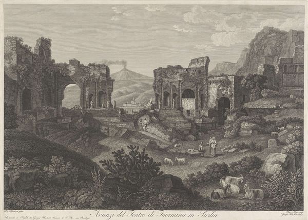 Joseph Wagner’s "Landscape with Ruins," made sometime in the 18th century, presents a world rendered in precise lines and tonal gradations that suggest both decay and enduring structure. The composition is arranged around the imposing ruins, a stark contrast to the small figures and animals that populate the foreground. Note how the detailed hatching and cross-hatching create a rich texture, emphasizing the weathered surfaces of the ancient architecture. The strategic placement of light and shadow accentuates the geometric forms, turning organic decay into ordered patterns, and integrating nature into a structured interpretation of decline. The ruins can be seen not merely as remnants of the past but as symbols of time's relentless and indifferent march. Wagner uses form to explore themes of temporality and permanence, setting up a dialogue between what crumbles and what remains. The artist invites us to see beyond the surface to a deeper contemplation on the nature of civilization and its inevitable decay.