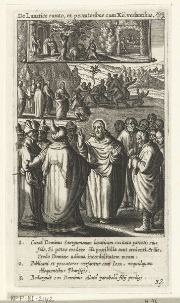 Curator: I'm struck by the sheer detail in this engraving. It's titled "Christ Appears to the Disciples and the Incredulous Thomas," and it dates roughly from 1590 to 1622, attributed to Boëtius Adamsz. Bolswert. It’s part of the Rijksmuseum collection. Editor: It feels almost claustrophobic, doesn’t it? So many figures packed together, rendered in such stark lines. The drama comes from this feeling of confinement combined with a divine manifestation. Curator: That compression is quite typical of the late-Mannerist, early Baroque period. Look how Bolswert stages the scenes, layering figures both in the foreground and background to represent sequential moments. We see the resurrected Christ appearing before his disciples, and the upper scene depicts his appearance within the locked room. Editor: And the materiality! As an engraving, the image relies solely on the incised line, right? The pressure, the skill in varying the width and depth…you really see the engraver's hand laboring over each mark. And the distribution network required to make such prints circulate. Curator: Exactly. The emphasis on line serves multiple purposes here. Spiritually, it evokes a sense of otherworldly, ethereal quality appropriate for the depiction of the miraculous. The fine hatching and cross-hatching create the shadows. It gives the sense of volume but at the same time, highlights the symbolism over the substance. Editor: Speaking of substance, you can practically feel the weight of the doctrines involved being rendered as reproducible printed form. I imagine each of these prints was traded and held within distinct socioeconomic networks for varying costs, according to class. It's interesting how faith itself becomes a product of the labor performed to materialize this moment. Curator: It does present the symbolic weight of the event—the validation of Christ’s resurrection through Thomas's physical examination of the wounds. It underscores the power of belief versus doubt, doesn't it? The importance of sensory validation to reinforce the intangible. Editor: Thinking about it from the vantage of the contemporary era in art, what resonates for me is the raw means by which people used images to convey such weighty spiritual concerns and philosophical precepts using only these techniques in print. I love it. Curator: A potent reminder of faith, doubt, and the transformative power of tangible proof made accessible by this printed devotional image!