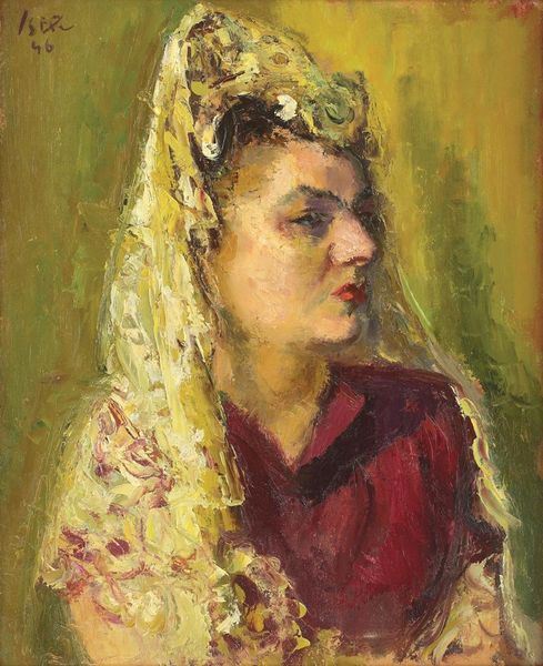 Editor: This is Minas Avetisyan’s "Mother's Portrait" from 1964, an oil painting. The palette is muted, but the expression in the mother's eyes is piercing. It makes me wonder about her inner life, the dreams or hardships she's seen. What do you see in this piece, looking beyond just the surface? Curator: What strikes me is the socio-political context in which Avetisyan painted this. It's the Soviet era, but he’s not creating idealized images of labor or communist triumph. Instead, he offers us a very human, intimate portrayal of a woman, likely a rural woman given her headscarf. What does it mean to focus on the individual experience of a woman, within a system that often prioritized the collective? What does it say about Armenian identity at the time? Editor: That's interesting. I was only focused on her individual experience, and the almost melancholic mood. But you're right, the setting probably had a huge impact. How does this relate to other portraits of women from that period? Curator: Well, many officially sanctioned portraits served a propagandistic function, presenting idealized images of women as workers or mothers. Avetisyan seems to be subverting that. Notice how he captures a sense of quiet strength and resilience. The rough brushstrokes, the earthy tones – it all conveys a certain reality that you wouldn't necessarily see in official Soviet art. It’s a very powerful act of resistance, to depict this woman with such honesty and dignity. Editor: So, you see it as a quiet act of rebellion, portraying the reality of women outside the dominant narrative? Curator: Precisely! It also forces us to think about how national identity, gender, and political ideology intertwine in art. Who gets to be seen, and how are they represented? That's the heart of it. Editor: That really reframes how I see this work! Thanks, I hadn't considered those layers. Curator: Absolutely, thinking of it in these broader terms allows a richer understanding.