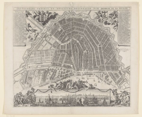 Curator: Wow, look at the density of that city—it almost breathes off the page, doesn't it? Editor: Indeed. We’re looking at Giovanni Battista Nolli’s “Plan of Rome,” created in 1748. It’s an engraving and etching, a meticulously detailed cityscape. Curator: Cityscape, yes, but it feels almost alive to me. Not just buildings and streets, but capturing Rome’s very spirit. You know, all that Baroque drama! Those converging lines just pull you in... like destiny. Editor: Quite right about the converging lines. Nolli employed precise, geometric perspectives. Note how public spaces are rendered as open, inviting areas, while private residences are starkly filled, an almost binary reading of societal life in the Eternal City. Curator: Binary—that’s cold. But the map itself… there’s a flow to it, almost like looking at veins, with everything connecting, leading you to something bigger. I mean, imagine Nolli wandering those streets himself. Must have been like feeling history pulse beneath his feet! Editor: One can speculate. Technically, however, we can appreciate Nolli’s use of line, its weight and consistency allowing for easy interpretation. This work serves as both a topographical record and a socio-spatial commentary via calculated arrangement. Curator: Haha! Socio-spatial commentary! I like that. A bit fancy for an old map maybe, but I get it! It’s more than just navigation—it's an invitation to lose yourself, you know? That beautiful, messy embrace of chaos and grandeur… you feel the human touch amidst all those tiny buildings. Editor: Undeniably, and one recognizes in this visual rhetoric a desire to impose order, which itself engages a subtle tension with the baroque dynamism you observed. It seems Nolli attempts mastery over Rome’s sprawling form through disciplined draftsmanship. Curator: Yes! Exactly! Control the chaos! Beautiful tension… Thanks, I'll feel it even more vividly next time I walk in Rome. Editor: As will I, perhaps newly sensitive to my attempt at rational mastery in interpreting this. Thank you for your insights.