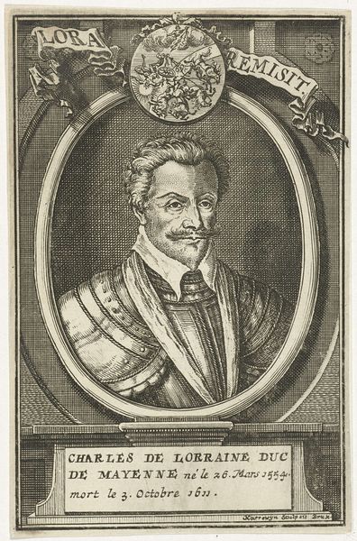 Editor: Here we have Jacobus Harrewijn’s “Portret van Charles de Guise, duc de Mayenne,” an engraving dating roughly from 1682 to 1730. It's a strong portrait, with this stern nobleman in armor framed by an ornate oval. I'm curious, how do you interpret this work beyond just a representation of a historical figure? Curator: It's fascinating how these portraits, seemingly straightforward, can reveal so much about power and societal structures. Looking at Charles de Guise, we see more than just a duke; we see a carefully constructed image of authority during a time of significant social upheaval. The armor isn't simply protective gear; it’s a deliberate symbol of military might and aristocratic privilege. How do you think the artist used composition to contribute to this message? Editor: I notice he's framed by text and the elaborate oval. Does that elevate his status further? Curator: Absolutely. The text, though in Latin and potentially inaccessible to many viewers then, contributes to an air of scholarly authority. We should also consider who had access to these images. Prints like this were often circulated among the elite, reinforcing a particular narrative of leadership and nobility. Consider the social context of portraiture at the time; it wasn't mere likeness but a form of propaganda. Editor: So it’s less about individual identity and more about reinforcing a certain image of the ruling class. I hadn’t considered the audience and the print's role in circulating these ideas. Curator: Precisely! Thinking about art as a tool for social conditioning gives us a far richer understanding than just admiring its aesthetic qualities. Hopefully it helps situate our thinking on history, race and social status. Editor: It definitely reframes how I see these historical portraits. There's so much more to unpack about power and representation!