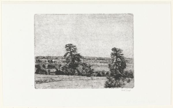Curator: Donald Shaw MacLaughlan, born in 1876, crafted this print, "Pastoral," a landscape rendered with remarkable detail, now residing in the Harvard Art Museums. Editor: There's such a nostalgic feel to it, isn't there? A quiet stillness hangs in the air. Curator: Indeed. The composition, a horizontal expanse, emphasizes the rhythmic repetition of forms—trees, fields—structuring the scene into distinct planes. Editor: It's like a memory fading in and out of focus. The etching technique, I imagine, lends that delicate, almost ephemeral quality. Curator: Precisely. MacLaughlan masterfully employs line weight and density to articulate depth and texture, invoking a specific sense of place and perhaps, a longing for simpler times. Editor: It’s funny how such a simple scene can stir up so much… yearnings for wide open spaces and slow living. Gives you something to ponder, doesn’t it? Curator: It certainly does. The work presents a structured yet evocative landscape, open to interpretation, and that's its strength.