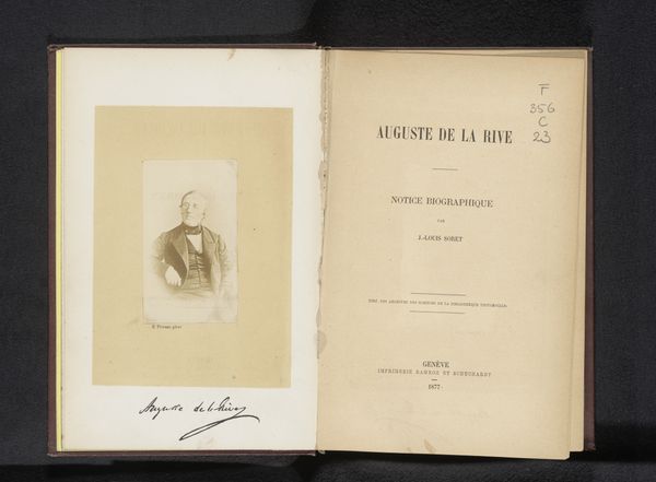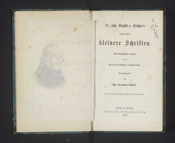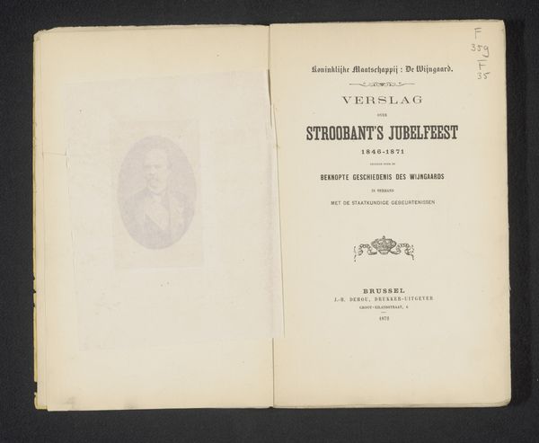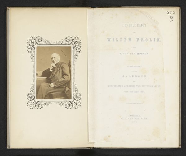 Curator: Here we have "Levensberigt van Willem Vrolik," printed in 1864. It appears to be a portrait and biographical text memorializing Willem Vrolik. What’s your first take? Editor: Well, immediately, I notice the paper itself—it's incredibly aged. You can practically feel the history just by looking at the textures and how they shaped the printing. There’s something satisfying about seeing the process revealed so starkly by time. Curator: It's striking how this aging also lends the portrait a sense of deep history. The paper’s fragility enhances the gravitas of the figure. There is a tradition here, you see? These memorials carried important social weight for the academic circles they came from. Editor: Absolutely. And, considering this was printed by C. G. van der Post in Amsterdam, the choice of materials reflects something about the culture of production at the time, doesn't it? I'd love to know about the quality, origin of that paper… was it commonplace or luxurious? Did it have social significance for this particular publisher or the academic world involved? Curator: These are excellent questions, essential for situating this piece! From a symbolic viewpoint, the typographic choices speak volumes too—that strong serif font for the title, offset against the handwritten font... These deliberate styles point to both authority and a personal, almost intimate remembrance. Editor: I see what you mean, the font does add a personalized flair despite it being a mass-produced print. I wonder if the printing was contracted, or printed on site at the academy. These are questions worth exploring. Curator: Indeed. The materiality and symbols work together to tell the story beyond just Vrolik's life; it whispers about the values of knowledge, memory, and the community that honors him. It also demonstrates continuity. Editor: Yes, the object really comes alive when you begin considering those interconnected layers: The hand of the maker, the history within the paper, and this layering together, which can open up fresh perspectives in cultural study.
