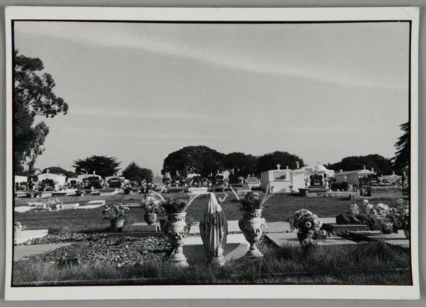 Editor: This is an untitled photograph, "San Pedro," by Bill Dane. It depicts a picnic scene under some rather impressive trees. There's a sense of quiet domesticity, yet also a feeling of anonymity. What do you see in this piece, especially in terms of symbols? Curator: The picnic blanket, the trees, and the parked cars - each element anchors cultural memories. The trees offer shade, a symbol of protection. The picnic, a social ritual, speaks to shared meals and community. The cars, though ordinary, represent mobility and the American Dream. Editor: So, you're saying these commonplace objects carry deeper meaning? Curator: Precisely. Dane captures the psychological weight of these symbols, linking them to a collective understanding of leisure and belonging in American culture. What do you make of the lone figure in the scene? Editor: I hadn’t thought of it that way before, but I see it now. It's like a snapshot of a shared experience, yet everyone is still alone. Curator: Exactly! Symbols operate on multiple levels. Our understanding evolves through dialogue.