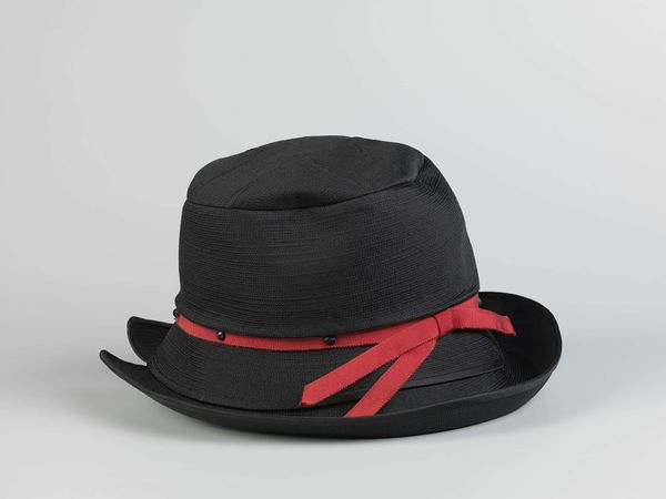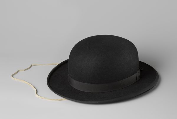 Editor: This photograph from around 1910 depicts a black felt bowler hat, trimmed with a black grosgrain ribbon, possibly for a female equestrian rider, and what strikes me is its almost stark simplicity and stillness. What narratives do you find within this photograph? Curator: It’s easy to see this simply as a fashion accessory, but placed within the era, it speaks volumes about the changing role of women. Equestrian pursuits were often a signifier of class and leisure, but also of a certain degree of independence. How does the utilitarian design, absent overt ornamentation, speak to broader socio-political movements of the time? Consider, for example, the burgeoning suffragette movement. Editor: So you are saying the absence of detail speaks louder than elaborate designs. Could it imply that these women equestrians weren't solely interested in tradition, or social expectation? Curator: Precisely! The "amazon" as you mentioned, would require freedom of movement and expression. The functional, almost masculine style, directly challenged accepted gender roles, and moved women beyond restrictive societal norms. What elements in the photograph contribute to that feeling? Editor: The stark monochrome, the strong lines of the hat itself… they definitely convey an idea of practicality and even power. It's amazing how much one item can say. Curator: Indeed. Objects hold immense cultural weight, becoming symbols within larger conversations. They provoke questions, prompt discussions, and demand a re-evaluation of assumptions. Editor: This gives me a whole new appreciation for what "still life" photography can actually express, by prompting viewers to contemplate not only beauty but historical narratives of intersectional power.