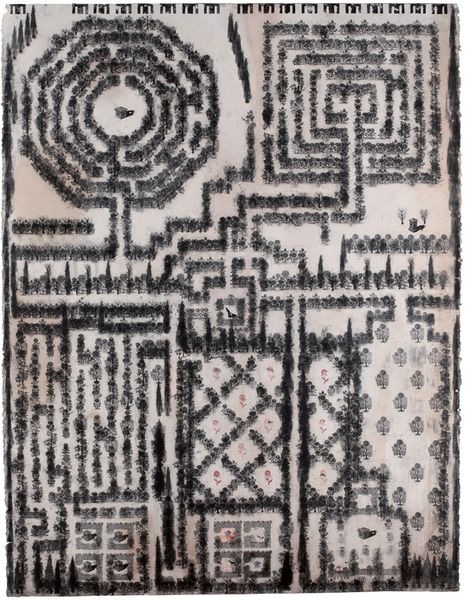 Pavlo Makov created 'Small Rosarium “East”' using what looks like delicate ink or watercolor washes to conjure a formal garden plan, or maybe even a city map. There's a sense of process here, a kind of building-up with tiny marks that reminds me of printmaking, where each layer adds to the whole image. Looking closely, you can see how Makov uses the texture of the paper and the fluidity of the ink to suggest depth and shadow. The washes are thin, almost transparent, allowing the white of the paper to breathe through, giving it an ethereal quality. Notice the top right corner, that circular maze – it's like a vortex, pulling you into the center, yet the softness of the edges keeps it from feeling too rigid. Makov’s work, with its repetitive motifs and architectural themes, shares a certain sensibility with Piranesi’s etchings of imaginary prisons, though Makov brings a lighter, more whimsical touch. Ultimately, this piece invites us to wander through its intricate pathways, appreciating the beauty of imperfection and the endless possibilities of interpretation.