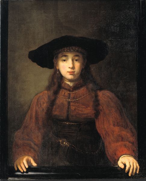 Editor: So, this is Aert de Gelder’s "Portrait of a Young Woman," painted around 1690, using oil on canvas. What strikes me is the subject's gaze - so direct, yet somehow…vulnerable. I wonder, what story do you think she's holding within, Curator? Curator: Story...yes! I think she's absolutely about to let us in on something, a giggle or maybe a world-altering secret... Look at the impasto; De Gelder laid down the paint almost like butter, creating light that shimmers rather than glares. It is a visual hug. This isn’t just paint; it’s bottled sunlight. Do you feel how present that makes her? Editor: A hug? I like that! It's not the stiffness I sometimes expect from portraits of this period. But what about that hat? It looks rather… flamboyant for the seemingly demure expression she carries. Curator: Ah, the hat! De Gelder, you rascal, playing with expectations. Perhaps that hat is the very clue to her mischievous spirit. Or a symbol! A marker of station, Or maybe De Gelder saw hats as metaphors – little shelters for our ever-wandering thoughts. What if she picked it out herself, or hated it. Those are the questions I'm drawn to, always. Editor: That tension is really interesting – a surface of formal portraiture clashing with an underlying playfulness. Curator: Exactly! And that interplay, my friend, makes this more than just pigment on canvas. It's a silent conversation, a gentle dance between what is seen and what remains tantalizingly hidden, between the era’s rigidity and the heart’s insistence on joy! What will you see next time you visit her? Editor: I'll definitely be looking beyond the hat – for the mischievous spirit! Thanks, that really opened it up for me.