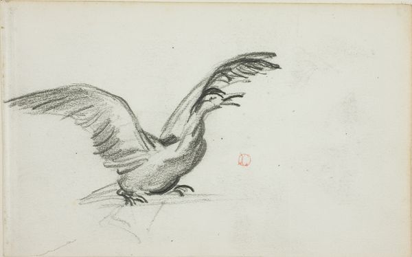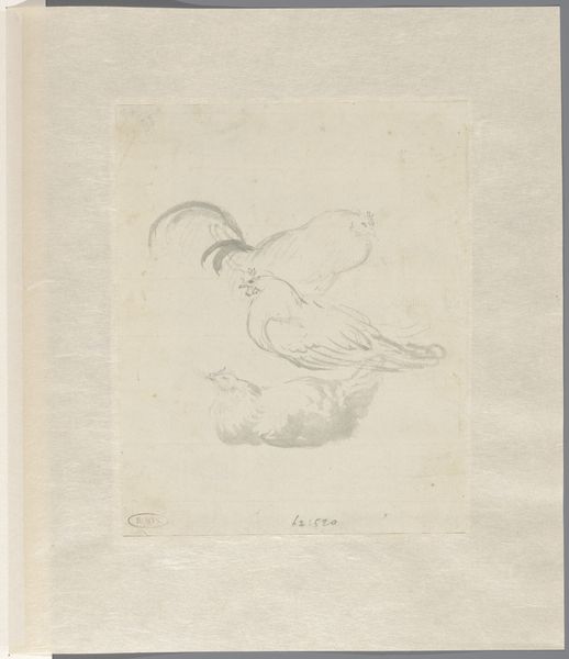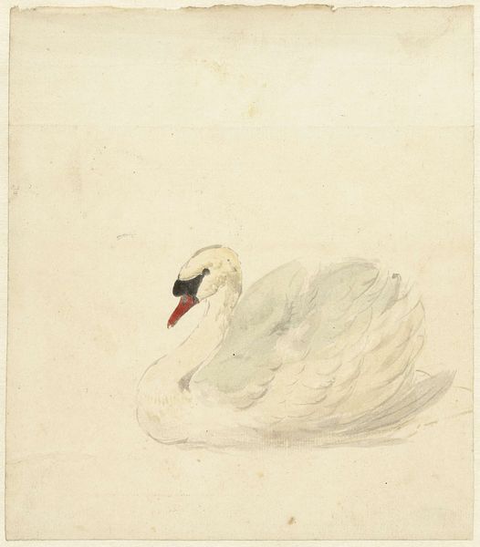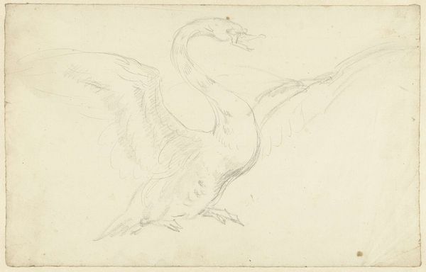 Curator: Here we have Aert Schouman’s pencil drawing, “Studie van een pauw,” which roughly translates to "Study of a Peacock." This artwork hails from sometime between 1720 and 1792 and resides here at the Rijksmuseum. Editor: It's remarkably sparse, isn't it? Just the barest lines capturing the form of the bird. It evokes a sense of stillness, of capturing a fleeting moment. Curator: Indeed. While seemingly simple, the peacock itself has been a consistent symbol throughout history, often associated with vanity, pride, but also, in Christian symbolism, with immortality due to the supposed incorruptibility of its flesh. Editor: So even this unassuming sketch taps into layers of cultural meaning? Curator: Precisely. The artist uses minimal strokes to render this iconic bird. Think about how Schouman manages to evoke the inherent cultural understanding that most viewers have concerning peacocks using only graphite on paper. Editor: From a formal perspective, notice the contrast in the linework—the delicate feathery strokes versus the firm outlines defining the body. The empty space around the figure is just as critical; it puts everything into sharp focus. It really centers on form stripped down to its essence. Curator: This tension also echoes the symbolic contrast inherent in the bird itself. The pride and showmanship versus the humble, perhaps mortal bird it actually is. The blankness surrounding the study allows for meditation, a moment of considering layers. Editor: The subdued character and pale hues of the paper lend it this air of having been found–as though from some naturalist's notebook, hinting at both the real world of scientific documentation as well as the symbolic one, almost like looking back in time itself. Curator: Absolutely. These types of preparatory drawings served not only as reference, but to explore a deeper sense of the symbol the artist seeks to capture within a more finished piece. Editor: It makes one contemplate the cultural weight we impose onto forms, how just a few lines can conjure a complex web of associations. Thank you. Curator: A potent demonstration of the artist’s talent to be sure, bringing with it all the symbolism we heap upon the noble peacock.