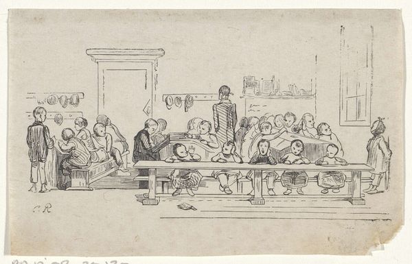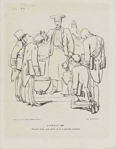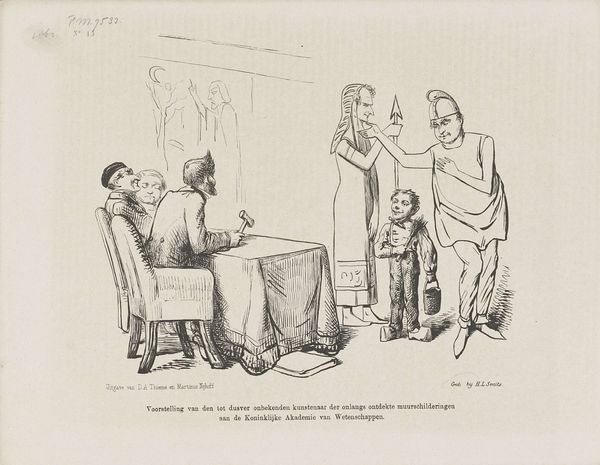Curator: Let's discuss this intriguing pen and ink drawing by Johan Michaël Schmidt Crans, titled "Spotprent op de Wet op het Hoger Onderwijs, 1860," created in 1860. Editor: Immediately, what strikes me is the composition – the way the artist uses stark lines and open space to create such a dramatic, almost theatrical scene. Curator: Yes, and considering the historical context, it's a potent critique. The title translates to "Cartoon on the Higher Education Act," so we know it's a direct commentary. I'm immediately drawn to the act of institutional critique through caricature here, in particular the figures arranged as if on trial or judgement. Editor: I notice how the garments worn by the figures create distinct structural shapes in the sketch: geometric robes with heavy falls, and more angular fitted clothing on those apparently in authority, each of which create depth and compositional relationships within the piece. Curator: Right, the contrasts within dress codes serve to reinforce socio-political messages about access and hierarchy. The men appear to be mocking scholarly pursuits and academic standards via the new Higher Education Act, thereby making light of institutional advancements in Dutch education and perhaps promoting access for the select few within an elitist social structure. Editor: And that mocking tone comes through purely in line and form; observe the subtle curves of their mouths, and their brow lines! The rendering may be swift, but each man possesses distinct facial qualities that communicate an acerbic emotional disposition. Curator: Exactly! It's about using humor as a weapon. By creating this tableau that depicts academia as both comical and severe, the artist challenges prevailing notions of education as the purported great equalizer and instead implicates systems in ongoing oppression and judgement of new academic and scholarly progress. Editor: For me, this rapid sketch reveals how fundamental artistic elements can create a very charged experience. The artist wields ink and pen, turning swift strokes into a surprisingly resonant moment, with structural clarity underscoring emotional and social undertones. Curator: Absolutely, the ability to connect broader power structures to a single captured instance offers a testament to the importance of artistic expression as a means to expose injustice, and critique norms. Editor: I am walking away with a stronger grasp on the artistic capacity of visual economy: here, a relatively minimal formal design wields maximal visual power.