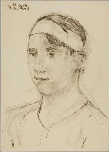 Editor: This is Denman Waldo Ross's charcoal drawing, "Profile Head of a Man." It gives me a strong sense of introspection. How do you interpret this work? Curator: I see the legacy of academic figure drawing intersecting with questions of class and masculinity. Is this just an anonymous figure study, or does it hint at the artist's socio-political observations? Perhaps this man represents the working class, often overlooked yet foundational to societal structures? Editor: That’s interesting; I hadn’t considered the figure’s potential social standing. Curator: What if the head covering isn't simply artistic drapery, but indicative of a specific profession or social context? Examining the artistic choices through a lens of social consciousness can reveal hidden narratives. Editor: I've definitely learned to consider art as more than just aesthetics. Curator: Precisely. Art can reflect and challenge societal norms, prompting us to question the power dynamics embedded within representation.