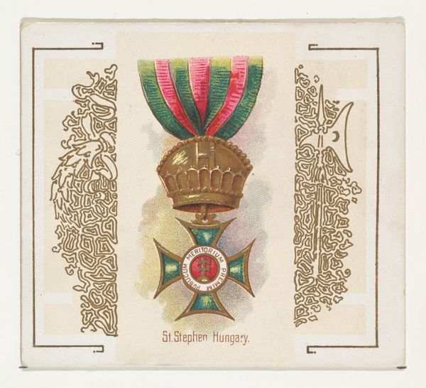 Editor: This is “Imperial Order of the Medjidie, Turkey,” a print from 1890 by Allen & Ginter, part of the World’s Decorations series. It depicts an Ottoman medal. I find the composition really striking – the central, vibrant medal juxtaposed with the softer background details. What stands out to you? Curator: Initially, it is the precision of the rendering which compels attention. Observe the meticulous gradation of colour on the ribbon, contrasted with the geometric severity of the starburst. The composition cleverly plays with the tension between ornate detail and structural form. Note how the symmetry is almost, but not quite, perfect, inviting closer inspection. Editor: That's fascinating. The almost-symmetry you pointed out… it gives it a very subtle sense of movement. But what about the overall design, its purpose? Curator: Strictly analyzing its visual construction, one sees that its merit rests entirely upon the balanced interplay between various shapes and their tonal values, carefully crafted to guide our eye from one design element to another. The texture creates visual tension against flat space. Editor: So you're saying that even outside the historical context, the artistry is in how these formal elements interact? Curator: Precisely. The symbolic meaning, while undoubtedly present, remains secondary to the formal organization of the visual field, the inherent design relationships embedded within the pictorial surface itself. The very concept behind visual structure creates depth, drawing viewers in beyond a casual appreciation. Editor: I never thought about it that way. Seeing how the forms interact, regardless of the subject, really opens up a new way of looking at art. Curator: Indeed, that kind of appreciation requires one’s acute attention. By acknowledging its inherent visual framework, we deepen our appreciation and transcend an ordinary viewing of Allen & Ginter’s work.