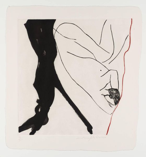 Curator: Allen Jones’ "III" throws me right into a dream—or maybe a slightly unnerving magazine spread. It's got that cool Pop Art vibe, but underneath, I sense something stranger. Editor: The work certainly grabs attention by spotlighting specific, constructed elements: sleek textiles and sharp angles. I’m immediately curious about the printing process, how such a flat surface manipulates spatial depth using relatively few layers. Curator: And isn’t that fascinating? The layering feels deliberate, like a carefully constructed narrative. The legs are so stylized, almost robotic, yet they evoke a powerful sensuality. Editor: Exactly. I see an interrogation of consumerism, of how we fetishize commodities, even—or perhaps especially—the human form. The artist's labor here seems focused on dissecting desire. Curator: It makes me wonder what stories Jones was telling himself, what fantasies he was crafting with these bold images. It's a peek into a world of calculated glamour. Editor: Agreed. It's a provocative reminder that the act of creating is also the act of producing meaning, both for the artist and for us as viewers—we are compelled to examine our own role in this exchange.