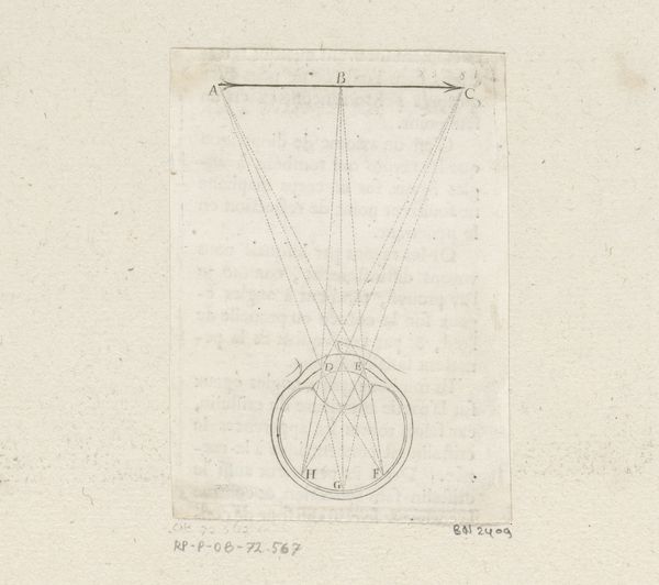 This etching by Sébastien Leclerc I, presents the dispersion and convergence of light rays on the retina. Consider the radiant sun, positioned at the apex, labeled 'A', its rays extending outward, a symbol deeply rooted in human consciousness, representing enlightenment, truth and the divine source of life. The eye, receiving these rays, acts as a lens, in a manner reminiscent of the all-seeing eye, a motif found in ancient Egyptian art and Freemasonry. Here, however, its appearance is scientific, devoid of overt religious connotations, yet subtly resonating with the motif’s ancient power. The convergence point on the retina evokes the idea of a singular truth, an objective reality perceived through the physical organ of sight. Leclerc's geometric depiction mirrors the sacred geometry found in Renaissance art, where mathematical precision was equated with divine order. The emotional power of such imagery lies in its ability to invoke a sense of cosmic harmony, engaging the viewer's subconscious with archetypal symbols, bridging the gap between science and the spiritual realm, illustrating the perpetual cycle of discovery.