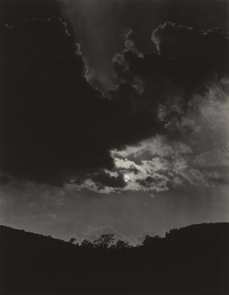 Curator: Here we have Alfred Stieglitz’s photograph, Lake George, likely taken around 1926. It’s a monochrome work capturing a landscape under a dramatic, overcast sky. Editor: Gloomy. That’s the first word that comes to mind. The composition, particularly the heavy clouds, really sets a somber tone. Curator: Stieglitz's landscape work, including scenes of Lake George, signifies a pivotal moment. The place itself was more than just a summer retreat, it was a nexus of progressive ideas, a space where women like Georgia O'Keeffe could cultivate artistic independence during a period of stifling societal restrictions. Editor: You can definitely feel the weight in the gradations of grey. Stieglitz has masterfully balanced light and shadow here, giving the image a strong structural underpinning. Note how the silhouetted trees in the foreground provide a stark contrast to the modulated tones in the clouds. It pulls your eyes upward and into the composition. Curator: Considering the broader narratives surrounding the art world at the time, one wonders about Stieglitz's vantage point, as a privileged white male photographer documenting an environment where women sought liberation. Is he capturing their perspective, or is it inevitably filtered through his own social position? Editor: Regardless of the intentionality, he clearly demonstrates control of photographic tone and texture, which serves a representational purpose; in other words, even capturing light is representational. He coaxes such nuance from a monochrome palette. It shows a deep engagement with the material potential of photography as a medium. Curator: But how does that materiality contribute to the power structures already at play? Does his choice to render this landscape in such a stark and almost romantic way further conceal or reveal the struggles and triumphs happening beneath the surface, particularly for women artists like O'Keefe in his circle? It becomes important to examine his creative decisions as inseparable from broader social and gender dynamics. Editor: Well, considering the interplay of elements within the image, from the dense foliage to the vaporous expanse above, I read a complexity that resists singular interpretation. Perhaps it’s precisely in those visual tensions that the artwork holds its strength, by enabling myriad, yet divergent perspectives. Curator: Perhaps it’s an image ripe for our continued critical probing. Editor: Indeed, a worthy testament to its aesthetic durability.