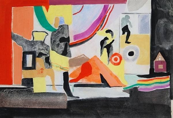 Conroy Maddox, he of the impersonal eye, seems to have made this painting with a light touch. The colors, all pastels and muted shades, suggest a calm and perhaps a hidden, quirky, humor. There's something so satisfying about the way the colors interact and overlap; that teal, for instance, playing against the soft lilac. Look at how the shapes are not quite representational, yet they hint at forms we recognize: vessels, figures, landscapes. The ground they stand on is no more than some scribbled lines, and I love the way the colors don't quite match-up. These little imperfections really make the work for me. It reminds me a little bit of Miro; Maddox has really carved out his own territory here. Art is an ongoing conversation, a process of seeing and re-seeing. Maddox isn't telling us what to think, but rather, inviting us to experience the world through his eyes.