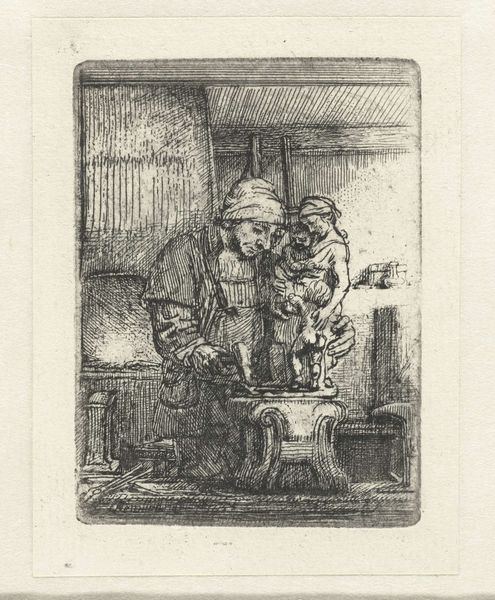 Research shows that no metalsmith in Rembrandt's day would have made a gold statue as large as the one depicted here, but that is not the point of this private little print. The image cradled so lovingly by the smith is Charity, personified by a mother protectively embracing her children. Rembrandt's audience would have responded immediately to this symbol; the Dutch provided more charitable relief in the seventeenth century than any other European country.
