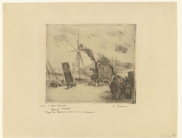 Willem Adrianus Grondhout created this etching, "Snow in the City," offering us a glimpse into the Netherlands during the late 19th and early 20th centuries. During this time, the Dutch art scene was grappling with its national identity amidst rapid industrialization and urbanization. Here, Grondhout captures a tranquil moment in a bustling urban environment. The snow softens the harsh realities of city life, creating a scene that feels both intimate and distant. The artist’s choice to depict this moment, with its interplay of social classes – from the figures in the horse-drawn carriage to the workers on the boats – invites us to reflect on the social dynamics of his time. The monochromatic palette evokes a sense of nostalgia, perhaps commenting on a longing for a simpler past amidst the changing landscape. Grondhout's "Snow in the City" subtly engages with themes of identity, class, and the evolving urban experience, prompting us to consider our own relationship to the places we inhabit.
