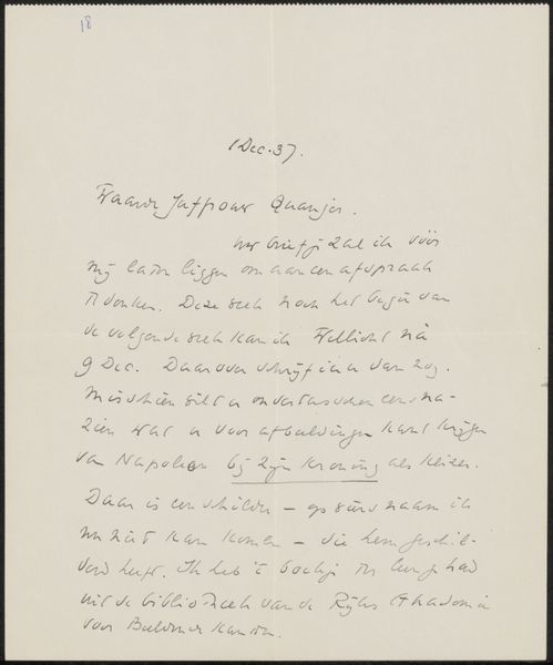 Curator: Here we have "Brief aan Willem Bogtman," a letter by Richard Nicolaüs Roland Holst, likely dating from around 1934. It’s rendered in ink on paper. Editor: The first thing that strikes me is its intimacy. It feels so personal, seeing the artist's own handwriting filling almost the entire sheet. It gives off this sense of direct access to his thoughts. Curator: Precisely! The monochrome presentation really enhances the feeling of peering into the past, doesn’t it? There's an undeniable immediacy offered by something rendered by hand. It invites contemplation of not only the artist's intention but also the craft involved in its creation. Editor: It makes you think about the actual labor. The repetitive movements to form these precise strokes and letterforms across an entire page is something you can really meditate on. How do the materials influence the final image and expression? How long did it take him? Curator: Absolutely, and that haptic quality connects us to the era's material conditions as well as their expressive conventions. Look closer, and the handwriting itself bears its own weight. Notice its slant and flow and rhythm, suggesting an almost meditative or devotional state. There's also that visual, almost gestural, component created with pen and ink in stark contrast with the page. It recalls images of a monk meticulously illuminating manuscripts. Editor: And the very idea of a letter as a physical object also seems worth considering. A carefully considered document meant to traverse time and space in a material fashion, it carries so much different weight than our current digital forms of correspondence. Curator: Indeed. Holst often imbued his pieces with hidden meaning through subtle choices of visual vocabulary. These private forms become carriers for something transcendent. Editor: This act becomes something truly special, with the materials themselves giving voice to social structures and histories beyond their inherent visual character. It makes you contemplate their life cycles too. Curator: I couldn’t agree more. These personal marks become evidence that there is so much meaning within such a delicate form. Editor: In looking at this artwork, I'm left pondering the relationship between intimacy and artistic creation. It really draws you in.