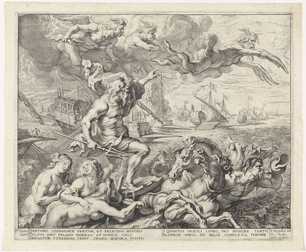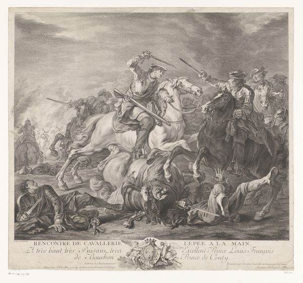 Curator: This engraving, "Apollo en Diana doden de kinderen van Niobe" by Jean Lepautre, made between 1650 and 1682, immediately strikes me with its dramatic composition. The balanced asymmetry, where figures scatter around the scene and lines seem chaotic, somehow harmonizes. What is your take on the engraving? Editor: It depicts quite a dark scene; there is chaos as Apollo and Diana rain down arrows on Niobe's children. It has such a strong Baroque feel but I’m finding it hard to pinpoint just what Lepautre is emphasising. What details should I pay closer attention to? Curator: Observe how Lepautre has deployed line. Note the use of cross-hatching to achieve tonal variation. The dynamic lines accentuate the tension and violence, the human drama. Lepautre makes this look effortless. Is this line work replicated across the engraving? Editor: I see what you mean. It is more complex near Apollo and Diana to bring their figures forward in space, giving a good sense of depth to the piece. This creates almost an other-worldly texture in that top area of the print. Curator: Exactly. And consider the overall arrangement. Figures scattered in carefully arranged poses which lead the eye around the narrative scene. This deliberate arrangement creates and enhances the visual narrative that reinforces Lepautre’s focus. This makes the composition dynamic and emotionally charged. How would you say these visual techniques relate to the period's stylistic preferences? Editor: I’d say it uses classic baroque tension to lead my eye through a story. Thanks, looking at the engraving like that has opened up new possibilities to what printmaking can do! Curator: Indeed, there is a delicate balance here, and a control of material expression. Seeing how visual tools make complex artworks feel effortlessly elegant helps understand Lepautre and this time in history a bit more deeply.