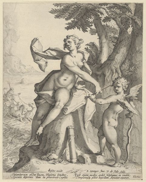 Curator: Girolamo Scarsello's print, made sometime between 1655 and 1680 after an original by Guido Reni, is called "Fortune flying above the globe, partly naked, emptying a purse in her raised right hand and holding a staff in her left, a winged putto pulling her forelock." The work is an engraving. What’s your immediate response to it? Editor: The swirling lines! They immediately create a sense of dynamism and instability. Even though the subject is allegorical, there’s an urgency conveyed by the hatching and the figure's precarious stance atop the globe. Curator: Precisely! Observe the composition. Fortune's diagonal pose bisects the picture plane, establishing a visual hierarchy between the earthly sphere below and the ethereal heavens above. The dense, almost chaotic, linework around the clouds contrasts sharply with the relative clarity of the globe. This creates visual tension, suggesting the turbulent nature of fate itself. Editor: Absolutely, and the symbolic weight of each element. We have the obvious symbolism of Fortune dispensing wealth— or lack thereof—but notice how she is pulled forward by the hair. This alludes to the idea that Fortune must be seized in the moment or lost forever. She’s an allegorical representation of opportunity and its fleeting nature. And the staff? Curator: The staff can be interpreted as a symbol of power and guidance. Though she offers fortune, she ultimately guides it. The globe beneath her feet suggests her dominion over earthly affairs. The purse, inverted, and the coins scattering speak of the arbitrary, and often capricious, distribution of wealth. Editor: It's such a fascinating cultural artifact. In baroque imagery, such depictions would serve as reminders of life’s uncertainties. Curator: I agree. What truly captures the Baroque aesthetic is how these representational objects form an intellectual construction that transcends pure decoration and invites further questioning. What power do symbols hold? Do such visual programs work in modernity, I wonder? Editor: Symbols continually evolve. This Baroque formulation, while rooted in its own time, laid the groundwork for later allegorical personifications, enriching art and shaping cultural consciousness for centuries to come. Curator: Indeed. Scarsello's technical skill transforms what could be a simple illustration into a meditation on structure, fortune, chance, and power, leaving a lasting impact on how we perceive the visual world.