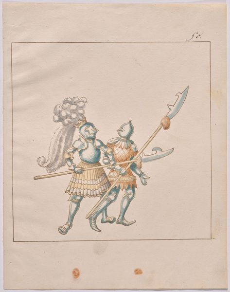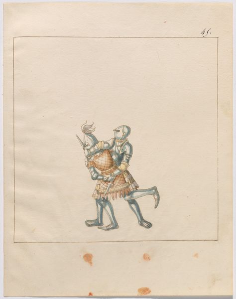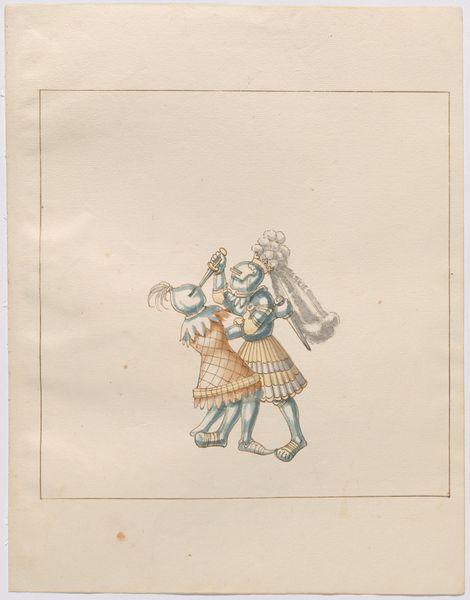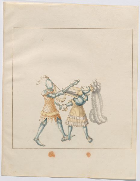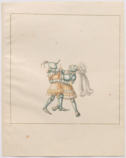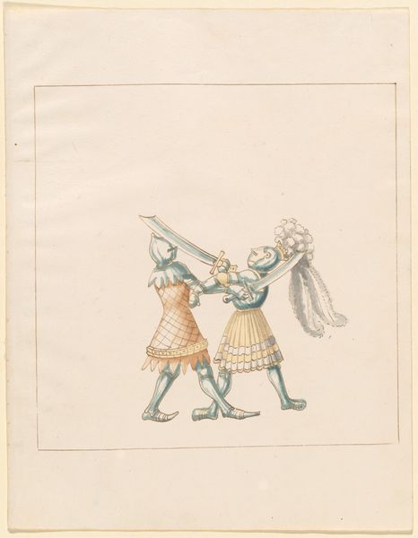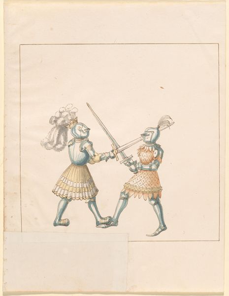 This watercolor on paper depicts two figures engaged in foot combat with longswords. Here, the sword is more than a weapon; it is a symbol of honor, strength, and the societal structures that define the players’ roles. Consider the raised sword, a gesture we see echoed through time in classical depictions of military power or even religious exaltation. Think of the Winged Victory of Samothrace, where the goddess Nike, though missing her arms, embodies triumph and divine favor through her poised stance, not unlike the stance of the figures depicted in the watercolor on display. The act of combat itself is a recurring motif—a dance of aggression and skill that goes back to ancient gladiatorial contests. It’s a potent reminder of our primal instincts, where conflict serves as both a destructive force and a means of affirming identity and status. This primal instinct, this agonistic impulse, is a deep, almost subconscious aspect of human experience, and it is one that we are constantly re-enacting in various forms throughout history. Symbols, gestures, and motifs recur, evolve, and resurface in different historical contexts and across epochs.