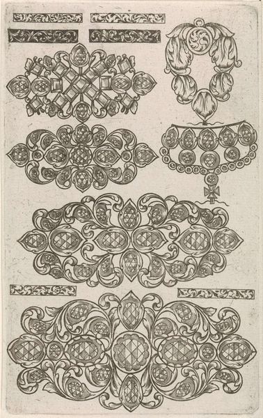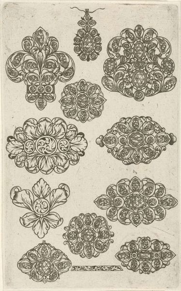 Curator: Welcome. Today, we’re looking at "Zeven ornamenten," or "Seven Ornaments," a print by Daniel de Lafeuille, dating back to around the 17th century. It resides here at the Rijksmuseum. Editor: At first glance, there's a pleasing symmetry to the collection of shapes, though the rendering seems flat; despite its subject, it feels oddly lifeless. Curator: Considering it's an engraving, likely with pen and ink on paper, we have to think about its function. These weren't meant to be admired as artworks themselves. Instead, consider the workshops of goldsmiths or jewelers in the 17th century. Here, this print acts as a kind of catalog, a resource of forms to be directly copied, modified, and ultimately transformed into precious objects for consumption. Editor: That's an interesting perspective. Breaking down each shape through semiotic theory, one finds a clear baroque sensibility, with repetitive, layered patterns combined in symmetrical relationships, communicating excess and ornamentation in a language any European aristocrat would immediately understand. The lack of color, in the end, accentuates the form, like a sculpture cast in neutral material. Curator: Absolutely, and that's where the materiality shifts. What began as mass-produced print transforms into singular objects of desire. Consider also the social status imbued by owning such intricate pieces – wealth, power, and access communicated via jewelry created using patterns disseminated in pieces such as this print. Editor: One can almost see the influence on rococo style jewelry some years later; yet here, the design lacks that additional layer of fantasy found in later styles. Curator: It is far more pragmatic in a way. So while perhaps flat initially, its impact on artisans who crafted the luxuries of the age cannot be overlooked. These ornamental designs weren’t just aesthetics, but material templates deeply connected to labor, economics and social aspiration. Editor: A crucial artifact for comprehending how concepts evolved into matter and, through wealth and influence, came to signify so much more. Curator: Indeed. A deceptively simple print that unravels a much more complex story.