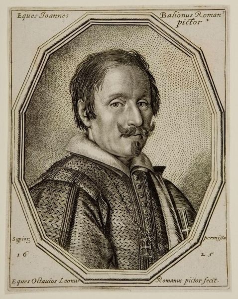 This is Ottavio Leoni’s portrait of Giovanni Baglione, made as an engraving. The octagonal frame immediately establishes a formal structure, within which the portrait is meticulously composed. The textures are striking – from the fine stippling that models Baglione’s face to the dense, cross-hatched patterns of his doublet. This attention to detail invites close inspection, yet the overall effect is one of controlled elegance. Leoni uses line and texture to define not just appearance but also social standing. The intricate details of Baglione’s attire, set against the relatively plain background, suggest a careful construction of identity. The portrait engages with ideas of representation and status, using a visual language that speaks to both the individual and the broader cultural context of the time. This interplay between form and meaning encourages us to consider how appearances are carefully crafted and what they communicate about power and identity.