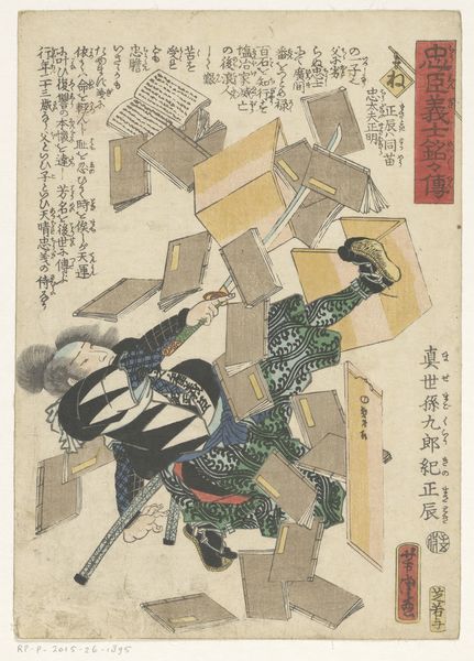 Curator: This woodblock print, created circa 1835-1839 by Utagawa Kunisada, is entitled "Nakamura Utaemon IV". Editor: My initial reaction is one of dynamic tension! The raking lines in the background create an incredible sense of urgency and focus, forcing your eye onto the figure in the foreground. It almost feels as though the figure is being propelled forward. Curator: Yes, Kunisada masterfully uses the Ukiyo-e technique. Note how the carving and printing processes were highly collaborative. Artisans specializing in carving the woodblocks and applying the colours worked closely to achieve this final print, each adding their expertise to the creation of this image. The quality of materials – the wood, the paper, the inks – also dictates the work's longevity. Editor: Looking at Utaemon's pose, and considering this is a Kabuki actor, what symbolic meaning might we draw from the sword held aloft? The bare feet? There's a rawness conveyed here that feels deliberately theatrical and yet psychologically revealing, don’t you think? Perhaps it is drawing on established symbols in Kabuki theatre. Curator: Absolutely. The production and consumption of these prints were directly tied to the Kabuki theatre industry. Actors were like celebrities, and their images were mass-produced for fans. We must also recognize the economic aspect here—the cost of the materials, the labour involved, the eventual sale price, all embedded within this object. It’s all a kind of performative craft. Editor: Indeed. He holds the sword so precisely. A figure caught mid-motion against this surge of abstract energy, creating a truly captivating study of action, artifice, and cultural iconography. Curator: Looking at the print's process and material choices gives a greater understanding of this artist's social world and the conditions of making art in Japan at the time. Editor: Ultimately, "Nakamura Utaemon IV" becomes a powerful expression of cultural identity and symbolic communication, revealing much about the performer as an idol.