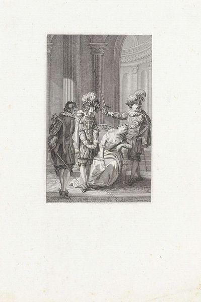 This etching, “Heren bij een tafel in een interieur,” was created by Daniël Veelwaard in the late 18th or early 19th century. An etching is an intimate art form. The artist covers a metal plate with a waxy, acid-resistant substance, then scratches the image into that coating with a sharp needle. The plate is then bathed in acid, which bites into the exposed metal, creating the lines that will hold the ink. Consider the skill required to execute this process, demanding control and precision. The artist skillfully manipulates the etching needle, guiding our eye through a scene of revelry. The relatively small scale invites close inspection. The material itself, a humble metal plate, belies the subtle nuances of light and shadow achieved through careful application of acid and ink. Etchings like this were often made in multiples, allowing for wider distribution and consumption of images. So, while the act of etching is inherently laborious, it also lends itself to a certain kind of mass production. By attending to both the material and social history of this image, we can appreciate the complex ways in which art and labor intersect.