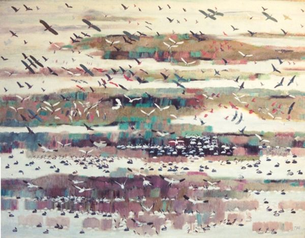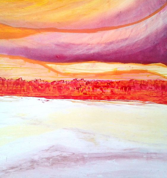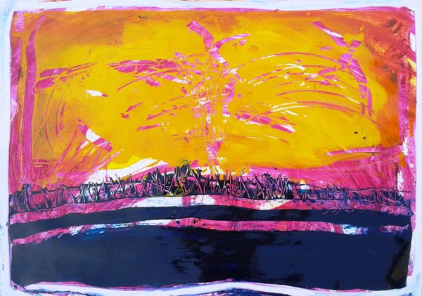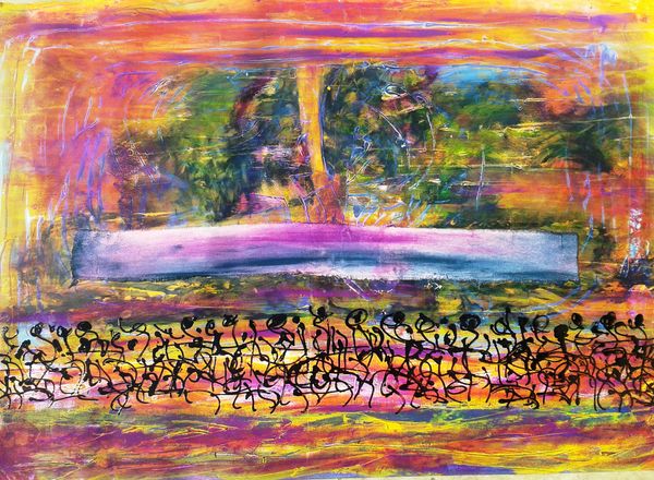 Jimmy Ortiz created this artwork, titled *2014 06 04 17.08.42*, with indeterminate materials and date. The composition arranges itself horizontally into blocks of color. At the bottom, white softly transitions into pink, followed by a band of ultramarine ornamented with black calligraphic flourishes, with a central mass of grey and black, dissolving into the blue and lavender shades above. The painting is a fascinating exploration of the interplay between control and chance. Ortiz uses line, colour and form to destabilize conventional modes of representation. The layering of hues creates atmospheric depth, while the calligraphic elements introduce a semiotic layer. These marks suggest language, but remain illegible, resisting fixed interpretation and inviting viewers to engage with the painting on a more intuitive level. Consider the dynamic tension between these gestures and the structural rigor of the horizontal bands, disrupting any sense of equilibrium and fixed meaning. Instead, the viewer is left navigating a space of visual and intellectual openness, engaging with art's potential for ongoing interpretation.