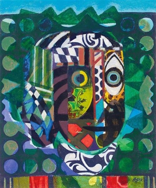 Editor: Here we have "Rite of Spring" by Eileen Agar, an acrylic painting. I’m immediately struck by the contrasting forms—the sharp geometrics versus the soft, almost floral elements. How do you approach a piece with such varied visual language? Curator: It is an engaging contrast, isn’t it? Formalistically, I observe how Agar orchestrates this visual dichotomy. Consider the spatial relationships: how the geometric shapes, rendered in darker hues, establish a structured, almost architectural framework, against which the lighter, organically-derived forms play. What impact do you think the chromatic choices have on this dynamic? Editor: I think the contrasting colors add another layer of complexity. The darker shades of black create a strong structure, while the central form with its rainbow palette becomes the focal point. Curator: Precisely. The controlled gradation within that central form, the subtle shift from cool blues to vibrant yellows and reds, generates a visual rhythm that draws the eye. Furthermore, observe the surface texture, particularly where the artist may have employed a spray can. How does that affect the overall composition, in your opinion? Editor: It softens those hard lines, perhaps creating a dreamlike effect, almost like looking at something through a haze. Does this piece sit comfortably within Surrealism for you? Curator: The tension between control and chance inherent in the spray application certainly resonates with Surrealist principles. The composition also incorporates several kinds of marks. Taken together, the structural framework that Agar has constructed here is further fractured by an almost psychedelic palette. That combination makes me understand it as Surrealist. Editor: That’s fascinating; I’m seeing the conversation between these elements so much clearer now, especially that calculated tension and release. Curator: Indeed, it is through the orchestration of form, color, and technique that the artwork realizes its dynamism and speaks its own peculiar language.