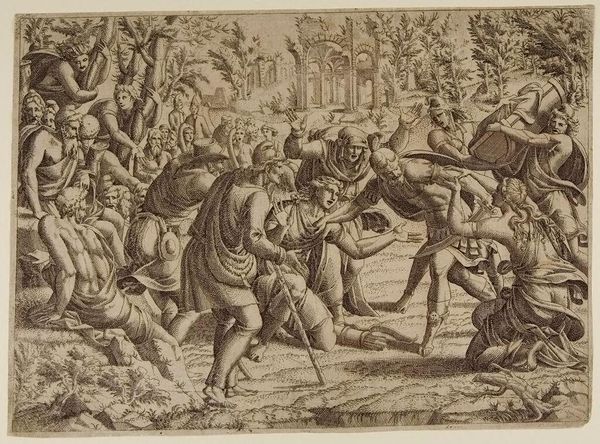 Curator: This is Giuseppe Niccolò Vicentino's "Death of Ajax," held here at the Harvard Art Museums. It has a raw, unsettling feel about it. Editor: Unsettling is right. The composition feels so compressed, almost claustrophobic. All those figures crowded together, witnessing something awful. Curator: Indeed. Notice how Ajax, a figure from Homer's Iliad, is isolated on the left, separated from the group by the trees and his own despair. Editor: He’s literally grounded, earthbound. The contrast of his posture with the upright, stoic, or judgmental poses of the onlookers is stark. Curator: The image uses dense lines to create a heavy, somber mood, reflecting the tragic weight of Ajax's suicide after being denied Achilles' armor. Editor: It feels like a study in shame and public spectacle—how one's internal battles can be amplified by the gaze of others. Curator: Vicentino captures a pivotal moment where individual tragedy meets the collective gaze of society, doesn't he? Editor: A poignant reminder that even heroes can be undone by pride and the pressures of expectation.