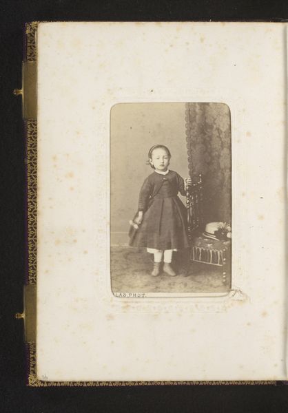 This portrait of a standing girl, by Rovira, is a photograph, likely made with the gelatin silver process which became dominant in the late 19th century. The photograph's sepia tone and small size suggest a carte-de-visite, a format popular for its affordability and collectibility. Consider the socio-economic context: photography's rise coincided with industrialization and a growing middle class. These small portraits democratized image-making, bringing it within reach of those who could not afford painted portraits. The process itself, while requiring specialized knowledge, became increasingly streamlined, reflecting the era's focus on efficiency. The girl's formal attire and the studio setting – complete with draped fabric and patterned carpet – speak to a desire for upward mobility. Each element, from the emulsion on the photographic plate to the girl’s carefully chosen garments, embodies a complex interplay of technology, labor, and social aspiration. By attending to these material details, we gain a deeper understanding of this small photograph as a cultural artifact.