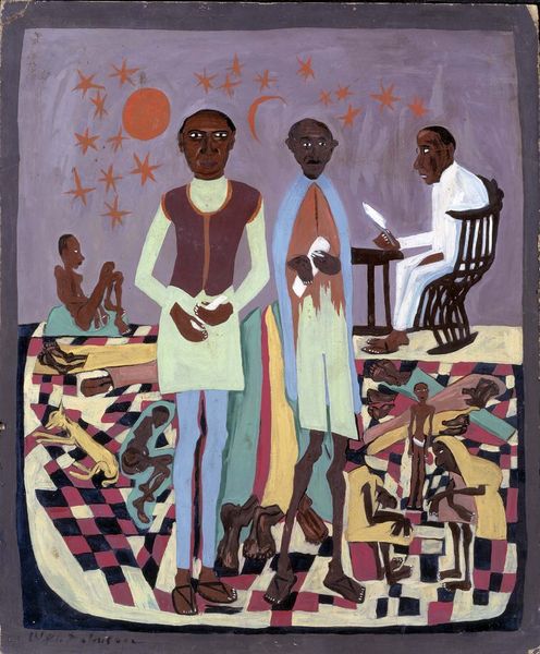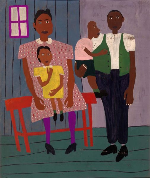 Curator: Welcome. We are looking at "Folk Family," an oil on board painting created in 1944 by William H. Johnson, an artist celebrated for his contributions to the Harlem Renaissance. Editor: It’s a beautiful work; the colors sing! I see so much affection radiating from this piece; the simple shapes are so expressive. It feels warm and approachable, yet with a tinge of melancholy, if that makes sense. Curator: Absolutely. Johnson's work often reflects the experiences of African Americans, rendering them in a flattened, seemingly naive style. This simplification belies a deeper engagement with identity and representation during a time of social upheaval and segregation. Look at the direct gazes. Editor: Those direct gazes command attention. And did you notice how their bare feet seem to root them to the earth, contrasting with the patterned clothing that almost obscures their forms? Almost a feeling of being grounded but also hiding from sight in plain view? Curator: The choice to portray the figures in a style reminiscent of folk art is critical. Johnson, influenced by modernism but also by his cultural heritage, challenges notions of high and low art, claiming space for Black subjects within the Western art historical canon. The bright colors also belie more subtle symbolic and cultural meanings here. Editor: It is an interesting blend, a mix of folk and modern, familiar and avant-garde. Thinking of family portraits more generally, it makes you wonder, who is this family, what’s their story? I'd love to walk into the painting to hang out. I find the flatness inviting; it has that “come on in” kinda vibe, no airs. Curator: And the intimacy of a "genre painting" made monumental. Johnson, as a person of color who travelled extensively in Europe, was certainly self-conscious of negotiating spaces that either celebrated or marginalized Black life. Editor: I am struck by the beautiful tenderness imbued here; a moment to reflect on. The children nestled within, and slightly clinging onto, the family—almost melancholic for a time that seems frozen forever within the dimensions of the board. Thank you. Curator: A powerful reflection. Johnson’s "Folk Family" provides a potent lens for reconsidering the complexities of American identity and artistic expression in the 20th century. Thank you for your time.