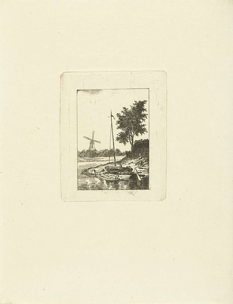 Curator: Oh, there's such a quiet, almost spectral feel to this little landscape. Editor: It's quite muted, isn’t it? More than that: restrained. What are we looking at exactly? Curator: This is "Rivierlandschap met knotwilgen," or "Riverside Landscape with pollard willows," by Otto Gampert. He created it sometime between 1892 and 1905 using etching, a printmaking technique, with ink on paper. It's a fantastic example of Impressionism, distilled into these fragile lines. Editor: "Fragile" is spot-on. Seeing how these fine lines produce the image through pressure, transfer, labor—it reveals more about Gampert’s process and, arguably, his reality than any attempt to purely imitate what's outside the studio. Curator: I find the limited palette very evocative. The silvery tones somehow perfectly capture that melancholic feeling one gets on a late autumn afternoon. The way the light touches those willows, reflected in the water… it’s poetry etched in ink. It also offers up an interesting study on positive and negative space. Editor: But consider the sheer multiplication involved in printmaking. Each impression flattens any claim to "authenticity". And the subject – laborers perhaps with cattle, set against simplified weeping willows—it's all been visually processed into something almost commercial, like a repeating, reproducible pattern. Curator: But the beauty, for me, comes from this dream-like quality, it feels very intimate, as if the landscape has receded into his mind. Almost dissolving into abstraction. Editor: Agreed! This “abstraction” you point to could show us something deeper: an unraveling of the social narratives these landscapes so often uphold. Its value lies precisely in those ink deposits, those small choices across the surface and their subsequent impact. Curator: Well, seeing it like this enriches it beyond its initial impact on me; thanks! Editor: And thanks to you, for revealing the emotional depth within what appears so restrained. A wonderful piece to reflect on the labor that has value, as well as its own cost of living.