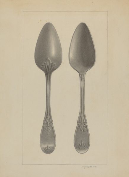 Editor: This is a drawing from around 1936 by Ellen Duncan, titled *Silver Serving Set*. It’s created with ink and pencil on paper. What immediately strikes me is the interplay of light and shadow to create that reflective, silvery texture. What do you see in this piece? Curator: Indeed, the artist’s focus lies within the representation of form and surface. Note the calculated use of hatching and tonal variation to suggest the curved planes and metallic sheen of the silverware. It moves beyond mere representation; Duncan engages with the inherent visual properties of reflectivity itself. Consider how the abstract linear patterns inscribed on the set’s surfaces interact with the overall form, creating a visually engaging dialogue between surface and structure. Editor: So, the artist is almost celebrating the qualities of reflectivity by accentuating the highlights and shadows. Curator: Precisely. The meticulous detail serves not to replicate the objects exactly, but rather to explore the artistic possibilities within their form. Are the stylized ‘M’s on each handle merely decorative or integral structural components? Editor: That's a fascinating question, actually! I think that focusing on these elements is making me notice the geometric variations between each utensil. Like, the way each form is uniquely contained. Curator: Absolutely, that unique visual quality in each contributes to the formal dynamic of the work as a whole. Editor: Okay, I am now seeing this in a completely different light; thanks to the conversation, I will surely explore her work. Curator: An object's intrinsic elements create many stories to unravel.