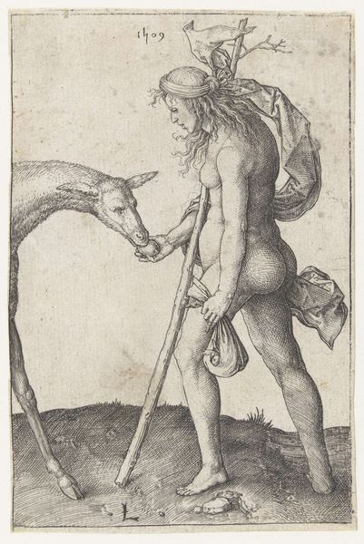 Curator: Lucas van Leyden’s “Woman with the Hind,” created in 1509, presents us with a seemingly simple encounter in nature. It’s currently housed here at the Metropolitan Museum of Art. Editor: It strikes me as almost dreamlike. The light is so even, making it hard to pin down a time of day. The nude woman and the deer share a space of quiet intimacy. It feels symbolic, but I can't immediately grasp what it's saying. Curator: The figure’s nudity certainly lends itself to symbolic readings, perhaps recalling classical depictions of innocence or a state of nature untouched by civilization. The hind itself has a rich history. We can read it as an emblem of gentleness, but also as a creature connected to Diana, goddess of the hunt. Editor: Yes! That relationship to Diana makes the whole composition feel poised. The woman’s offering of what looks like an apple creates a suspended moment, a prelude. Is it an offering of peace, or something more complex? Are we on the brink of a fairy tale moment or is this a memory of one? Curator: And Leyden's technique heightens the ambiguity. He’s using engraving here. His ability to capture the soft textures of the skin and the fur in such stark lines is impressive. Editor: The fine lines give the work a kind of…whispered quality. It's like catching a glimpse of something hidden, something that feels both very old and timeless. Curator: His mastery of line creates a captivating texture that almost asks us to touch the figures. What I always come back to with Leyden, is how skillfully he integrates the Italian Renaissance ideals into Northern printmaking traditions. It's like a merging of worlds. Editor: Thinking about it, it embodies a delicate dance between vulnerability and power, something ancient yet utterly present. Thanks for unveiling some of its secrets! Curator: The real magic lies in how the image continues to evoke contemplation through time, inviting us to reconsider what we think we know about humans and the natural world.