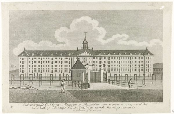 Editor: Here we have Jan van Call’s etching, “Gezicht op het Stadhuis van Amsterdam vanaf het Singel,” dating roughly from 1675 to 1711. It depicts a grand view of Amsterdam’s City Hall, showcasing its imposing structure along the canal. The thing that stands out to me is how this print shows everyday life happening right next to the center of power. How would you interpret the meaning behind this image? Curator: It is a really intriguing image that encapsulates much of the material conditions of the time. We see labor explicitly depicted - from the figures on the bridge with what looks like barrels, to the boat on the canal. The building itself speaks volumes about the Dutch Golden Age. Consider the materials that went into constructing such a grand edifice. Where did they source the stone? Who were the artisans and laborers involved, and what were their working conditions? Editor: So, it is not just about the power represented, but about the physical effort and materials involved in making that power visible? Curator: Precisely! Think about the act of creating this print itself. The copperplate etching process demanded skilled labor, specific tools, and a workshop. The circulation of such images democratized the viewing of architectural achievements, bringing it to a wider audience for consumption and perhaps even a critique of societal resources. Is this just a celebratory picture, or something more? Editor: It’s fascinating to think about how this seemingly simple print opens up a discussion about labor, consumption, and even the politics of materials during the Dutch Golden Age. It moves beyond just admiring the artistry to questioning its means of production. Thank you for helping me understand the social implications embedded within the image. Curator: My pleasure! It’s in dissecting these layers that we truly grasp the depth of art’s connection to its time.
