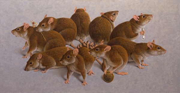 Carl Reichert made this artwork, Mäuse, using watercolor and gouache. Gouache is an opaque watercolor paint, lending itself to matte surfaces with rich color. Reichert’s choice of gouache creates a soft texture, emphasizing the fur of these mice. The painting’s precision and detail make it an impressive feat of craft and technique, especially since it was made during a time when photography was rising in popularity. In that sense, the work is not only a testament to the artist’s skill, but also to the value placed on handmade images during the Industrial Revolution. During this period of mass production, the value of unique handmade objects grew, partly in response to the increasing uniformity of industrialized goods. A watercolor like this one then becomes an emblem of specialized labor and careful, close observation. It reminds us that making involves time, skill, and individual creative expression.