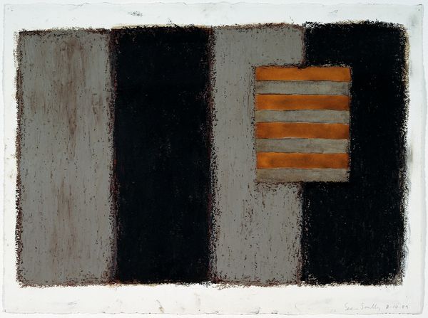 Curator: Sean Scully's "3.24.89," held at the Tate, presents a compelling study in horizontal and vertical forms. At roughly 57 by 77 centimeters, it’s rendered with a muted, almost chalky texture. What's your immediate reaction to this work? Editor: The somber palette immediately evokes feelings of constraint and confinement. It’s like looking at a barred window or a gate, but there’s also something inherently calming in its rigid structure. Curator: That's a perceptive read. Scully’s work often explores the emotional power of simple geometric forms, reminiscent of architectural structures. These visual components carry cultural weight, reflecting our innate desire for order. Editor: And the date included in the title makes me wonder if it refers to a specific event or personal experience, adding a layer of narrative that invites further analysis. It is also worth noting how the imperfection of the lines suggests an awareness of its limitations, or even potential freedoms. Curator: It’s interesting how Scully uses these imperfect lines to disrupt the strict geometry, creating a tension between the planned and the spontaneous. These types of details are what make it enduring and emotionally charged. Editor: Indeed, it’s this interplay of control and chaos that transforms what could be a cold, abstract composition into something deeply human and relatable.