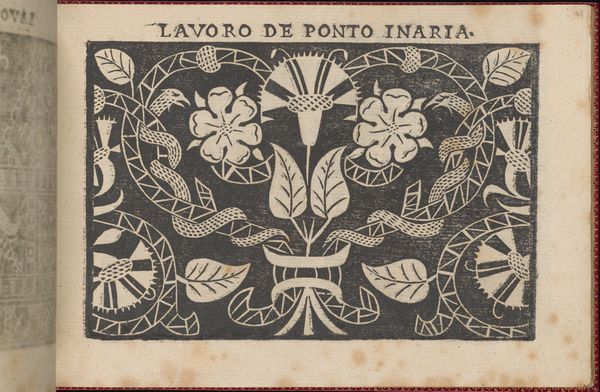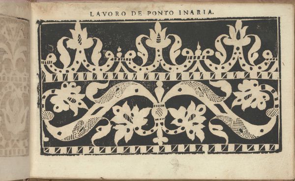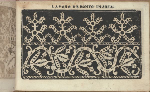 This is a page from "Pretiosa Gemma delle virtuose donne" by Isabella Catanea Parasole, dating back to the late 16th or early 17th century. The print presents a striking visual experience through its stark contrast of black ink against the light paper. This aesthetic choice immediately draws us into the intricate details of the composition. The design unfolds in horizontal registers. Each zone features stylized flora and fauna rendered in precise lines and shapes. Parasole masterfully employs symmetry and repetition. These design elements create a visual rhythm across the page, while the stylized motifs evoke a sense of artifice and refinement. This pattern book functions as a template. It offers designs for elaborate needlework to cater to women of the era. The structure of the page reflects contemporary notions of femininity and domesticity. The meticulous patterns suggest the values placed on skill, patience, and artistry. The stark, graphic quality of the print, which is characteristic of woodcuts, emphasizes line and form. This highlights the function of the designs as guides for replication. The artwork provides a glimpse into the aesthetic sensibilities and cultural codes of the time. It underscores the complex relationship between art, craft, and gender in early modern Europe.
