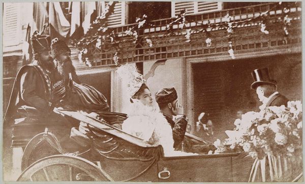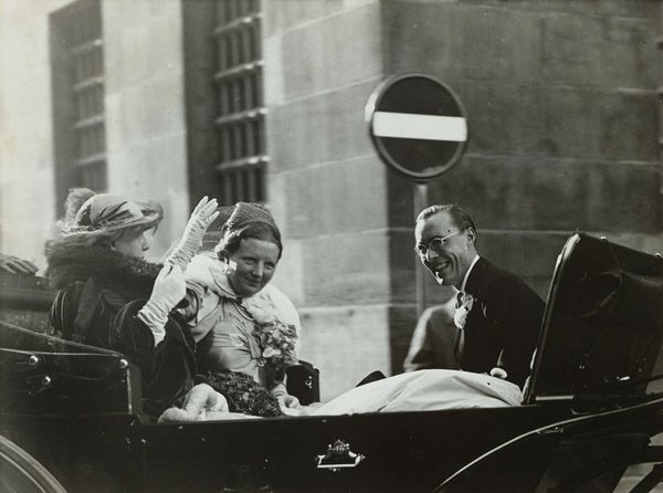 Editor: This gelatin silver print, titled "Juliana, koningin der Nederlanden, Beatrix, koningin der Nederlanden, en Irene, prinses der Nederlanden, in een auto te Den Haag op de verjaardag van Juliana op 30 april 1940," captures a moment of the Dutch royal family. The composition seems quite spontaneous. How do you interpret this work formally? Curator: It's intriguing. Notice how the composition, while seemingly candid, relies on strong geometrical lines: the car window bisecting the image, creating a defined foreground and a blurred background. Consider the light – it’s flat, almost documentary, devoid of dramatic chiaroscuro, typical of formal portraiture. The flatness directs the eye not to emotional depth but rather towards the subjects and textures within the scene. Editor: The graininess, in particular, lends a raw, almost unpolished quality. Curator: Precisely! This roughness removes any sense of idealization, highlighting the materiality of the photograph itself. We’re not looking at an event; we’re looking at the *thingness* of the photograph. Observe the repeated shapes—the circular hats echo in the faces, drawing a visual harmony. How does this rhythmic repetition affect your perception? Editor: I see the rhythm; it makes the photograph more dynamic, despite the static poses. The focus shifts from the individuals to a unified image, structured around geometric forms. Curator: Indeed. By focusing on elements such as line, form, texture, and composition, and overlooking any sociocultural implications, the work stands alone as an object for our examination. The emphasis is not on what's depicted but how it's depicted. Editor: It’s interesting how deconstructing it in this manner actually helps give it structure and focus. Curator: Indeed. It provides a unique approach. Focusing solely on form unveils a structural complexity we may have overlooked at first glance.