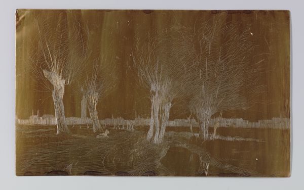 Editor: This is Willem Witsen’s "Bos in Ewijkshoeve," an etching from around 1886. The bare trees create a rather somber mood for me. How do you interpret this work? Curator: Well, look at how Witsen uses line. Notice how the density of lines suggests both light and shadow, and emotional depth? Etchings often evoke memory due to the laborious process, connecting us to the past. What emotions are stirred when you consider its existence as a symbol of persistence across time? Editor: That’s fascinating. I hadn't thought about the etching process itself contributing to the meaning. I suppose it amplifies that melancholy feel, reflecting on things that linger or slowly fade. Curator: Precisely. Think of the forest as a common symbol throughout history— a place of mystery, transformation, and the subconscious. What aspects of this archetype seem to be communicated here? The tight vertical lines suggest not just literal trees, but maybe the human struggle for understanding amidst life's density. Editor: I see it now, there is more to it than just a gloomy forest. I never considered the weight these symbols carry. Curator: Exactly. Witsen uses familiar symbols to tap into our collective unconscious, resonating through time. Each viewing offers the chance for introspection by uncovering personal symbols within the overall forest narrative. Editor: I'll definitely look at landscapes differently now, appreciating the power of symbolic visual language. Thanks for offering your interpretation, this helped open up this piece. Curator: It was a pleasure to share some thoughts. Every artwork offers a window into ourselves when we approach it with curiosity about its symbolism.