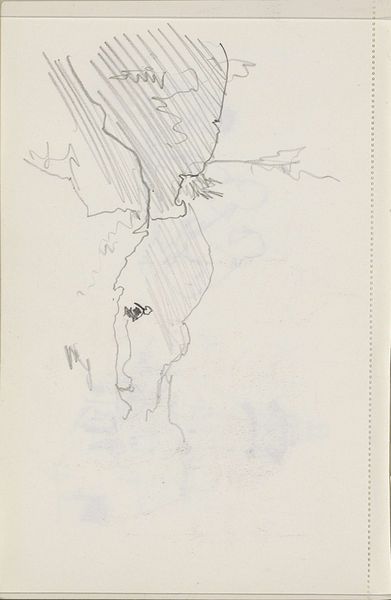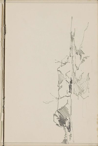 Curator: This is Cornelis Vreedenburgh's drawing "Hooiberg naast een boerderij," placing us somewhere between 1890 and 1946. It resides here at the Rijksmuseum. What's your initial impression? Editor: Stark and incomplete. The sketchiness gives a glimpse into the past but leaves much to the imagination. There's a haystack and the suggestion of a farmhouse, but the details are minimal. Curator: Observe the economy of line, though. Vreedenburgh's swift strokes, primarily in pencil and perhaps some pen work, capture the essence of rural architecture. The artist creates a sense of depth. Note how the darker shading describes forms such as the roof of the hay stack and the wall. Editor: Right, it’s a study in contrasts – the dense shading gives the scene some weight, while the unfinished aspects foreground process. I wonder about the farmer or farmhands who would have built this stack—I think it's important to acknowledge labor. It seems absent in a lot of classical art. Curator: And yet, without such technical precision, this rendering wouldn’t possess the aesthetic harmony that it does. I am most interested in how forms meet one another: observe how a tree branch guides the gaze across the page while softening what would be rather rigid architecture. Editor: True, those skeletal branches are a wonderful counterpoint to the architectural elements. What type of labor do they perform? I see a reminder that a house is built from trees that take decades or longer to mature—not simply materials manufactured in a warehouse. It asks us to contemplate temporal depth. Curator: Ultimately, whether viewing the drawing as a technical exercise or considering its implications for rural life, the work offers insights into Vreedenburgh's world, an agricultural Netherlands undergoing great social changes at the beginning of the 20th century. Editor: Indeed. "Hooiberg naast een boerderij" gives us pause to think not just about art, but about work, material, and landscape itself. It seems both very simple, and very important to attend to details in order to perceive the work within.
