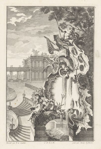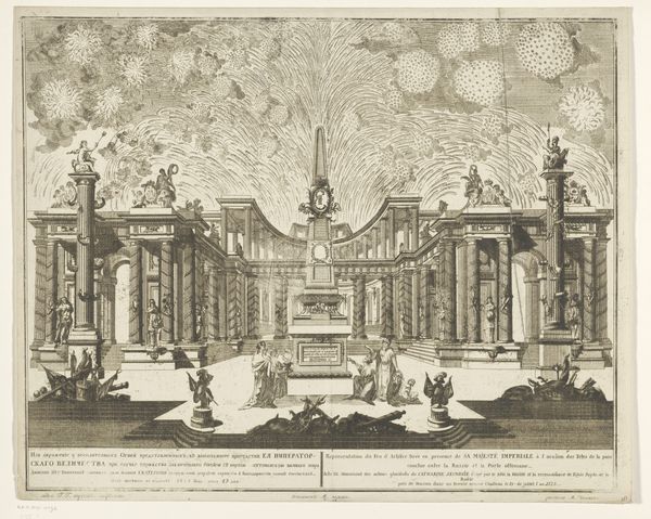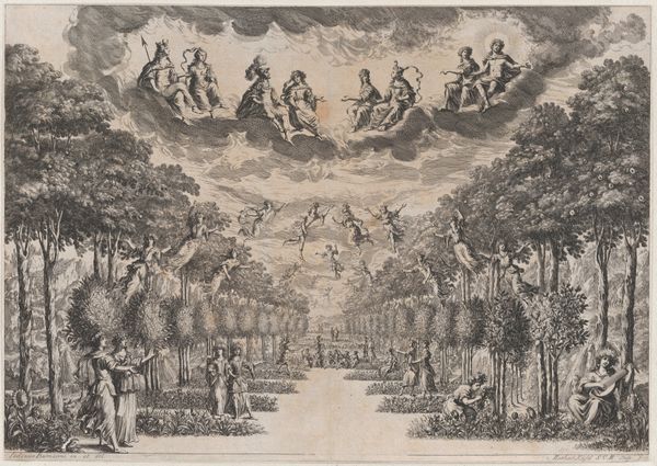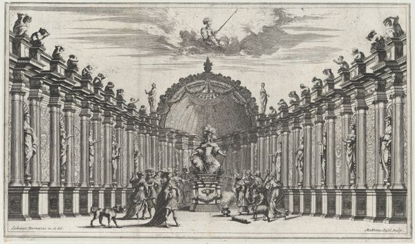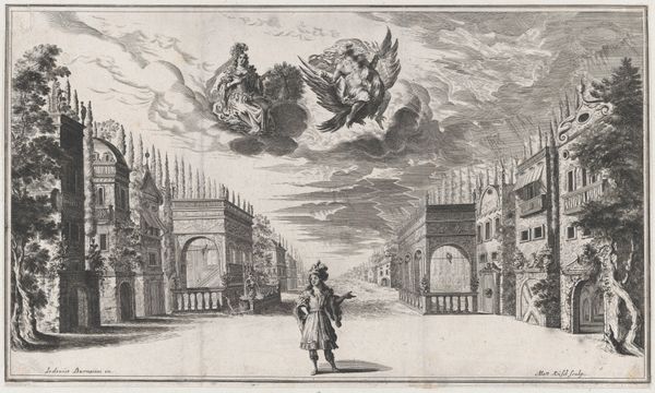 Mathäus Küsel created this set design from 'Il Fuoco Eterno' using engraving techniques. The formal structure is immediately striking. The converging lines of the colonnade create a strong sense of depth, drawing the eye towards the fiery spectacle at the vanishing point. The interplay of earthly and ethereal elements presents a fascinating dialectic. The rigid, ordered columns contrast with the fluid, chaotic clouds and flames. Semiotically, the fire, woman, and cupid are powerful signifiers of passion, transformation, and desire, while the formal structure and statue suggests themes of order and power. Ultimately, Küsel's work is a study in contrasts, where the earthly and divine, order and chaos, converge to explore the complex interplay of human emotion and experience. It's a reminder that art constantly invites us to question established values and meanings.